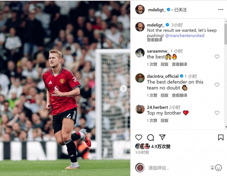 德里赫特此役为曼联踢满全场,赛后他在社交媒体上写道:“这不是我们想要的结果,让我们继续努力!”