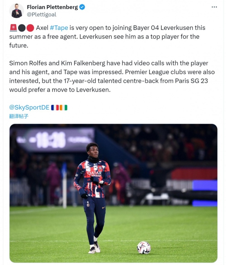 塔佩与巴黎的合同今夏到期,普莱滕伯格指出,这位小将对免签加盟勒沃库森抱有非常开放的态度,而药厂将其视为未来的顶级球员。