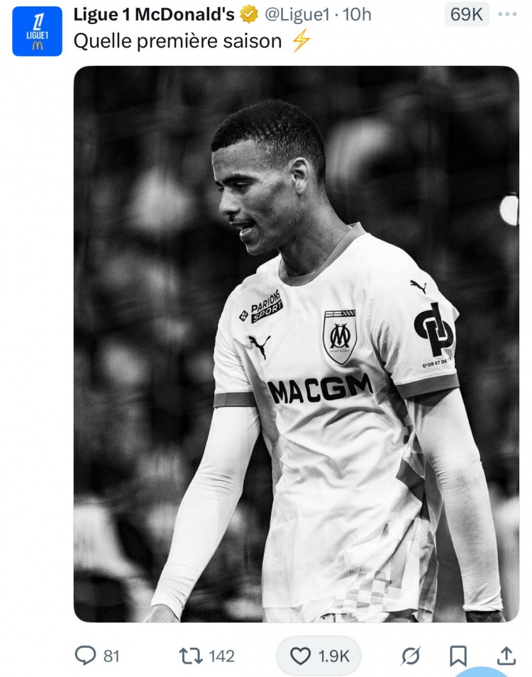 法甲官媒晒出了格林伍德的照片,并配文称赞道:“法甲首赛季,你的表现多么精彩绝伦!”