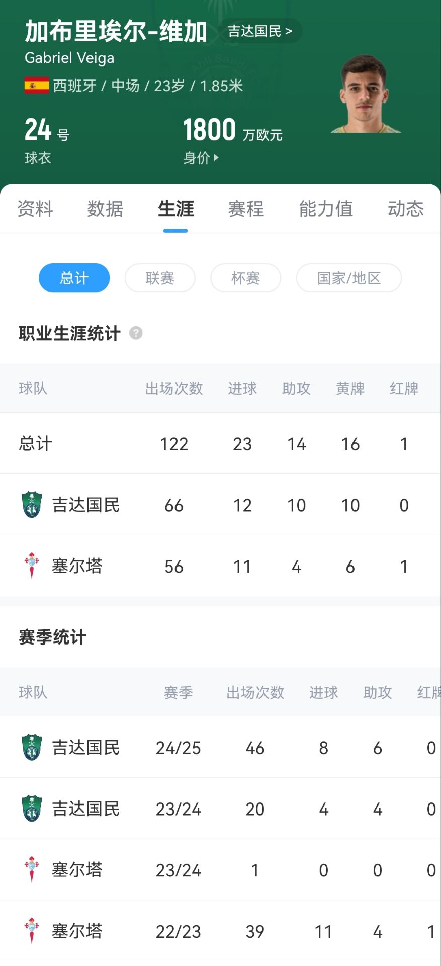 2023年夏天,吉达国民花费3000万欧从塞尔塔引进维加,本赛季维加在吉达国民共出战46场,贡献8球6助攻,帮助球队赢得本赛季的亚冠冠军。
