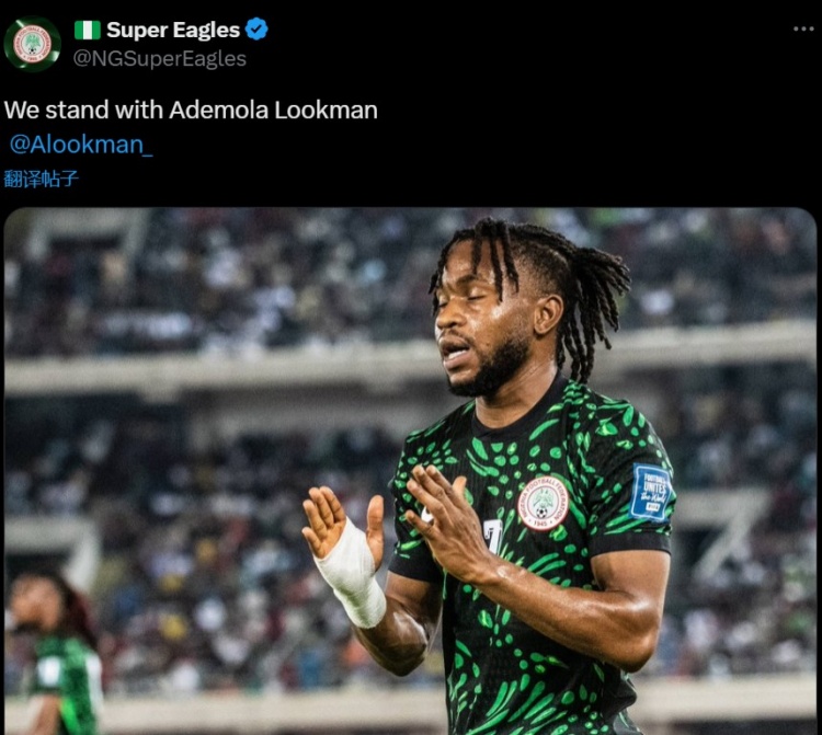 卢克曼效力的尼日利亚国家队也下场参与了这场风波,尼日利亚更新社交媒体写道:“我们与卢克曼同在。”