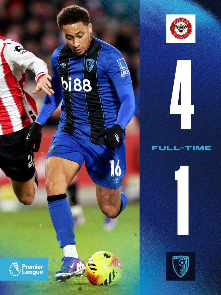 12月28日讯 英超第18轮,伯恩茅斯1-4惨败给布伦特福德,暂居英超第15名。